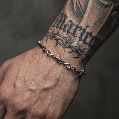 Looking for something that screams rebellion? The Barbed Wire Bracelet is your go-to for an edgy, bold look. Featuring twisted wire segments with sharp, spiky barbs, this bracelet adds a touch of raw punk style to your outfit.