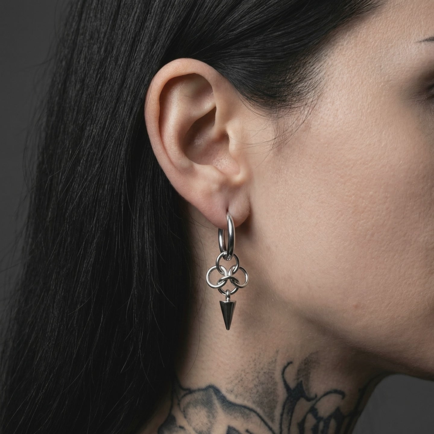 Clean hoop up top, chaos below. A compact spike drop that hardens any fit without trying.